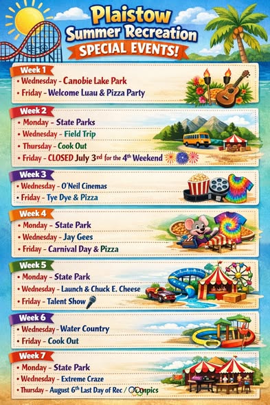 The Plaistow Summer Rec program has been a cherished tradition for decades, providing children with an exciting and enriching summer experience. Each week is themed and packed with engaging activities designed to keep campers active, creative, and entertained. Days are filled with a variety of opportunities, including sports, arts and crafts, and fun field trips to exciting destinations. Campers will also take part in community events and enjoy special guest appearances, bringing unique experiences to their summer adventure. With experienced staff, a welcoming atmosphere, and a dynamic schedule of activities, Plaistow Summer Rec is the perfect place to make new friends, explore new interests, and create lasting memories.